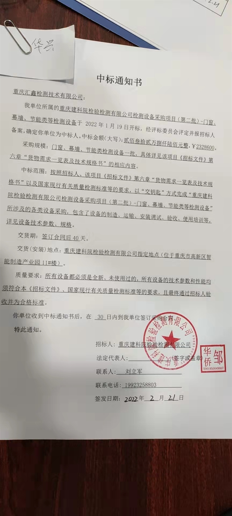 重慶建科院檢驗檢測有限公司委托重慶華興工程咨詢有限公司對我公司檢測設備采購項目(項目號:HXZX-2021-30 )重慶建科院檢驗檢測有限公司檢測設備(第二批)-門窗、幕墻、節(jié)能類等檢測設備進行了公開招標采購,現已完成全部采購程序。確認重慶匯鑫檢測技術有限公司為檢測設備(第二批)-門窗、幕墻、節(jié)能類等檢測設備采購項目中標人,中標價為2328600元(大寫:貳佰叁拾貳萬捌仟陸佰元整)。