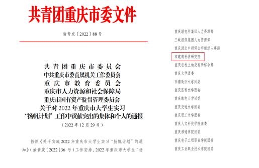近日,市委直屬機關工委、市教委、市人力社保局、市國資委、團市委對在 2022 年重慶市大學生實習“揚帆計劃”工作中做出突出貢獻的 97 個組織、 95 名工作者以及表現出色的220 名優秀學生進行了通報。其中,重慶市建筑科學研究院有限公司(以下簡稱公司)獲得貢獻突出組織稱號,公司黨委辦公室實習學生程慶(重慶交通大學)獲得表現出色個人稱號。