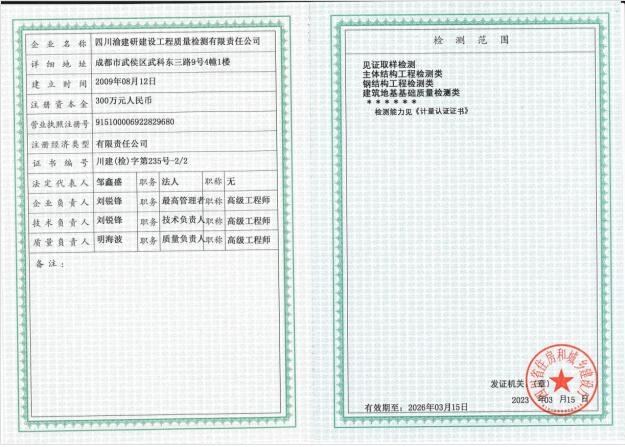 近日,經(jīng)四川省住房和城鄉(xiāng)建設(shè)廳核準,重慶設(shè)計集團市建科院所屬子企業(yè)四川渝建研建設(shè)工程質(zhì)量檢測有限責任公司(以下簡稱“渝建研”)申請重新核定的建設(shè)工程質(zhì)量檢測機構(gòu)資質(zhì)于2023年3月成功獲批并順利取證。
