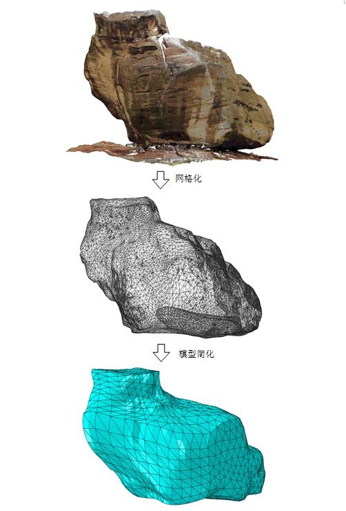 紗帽石穩定性進行評估過程中,市建科院技術團隊與重慶交通大學相關專家經過多次溝通,確定了定性分析+數值模擬的評估方案。評估中定性分析了紗帽石的當前所處環境、形態特征、結構特征、破壞模式等,作出紗帽石穩定性定性分析初步評價。另外,評估采用三維激光掃描儀,對紗帽石進行3D掃描,復原出紗帽石的三維模型,再將其導入有限元計算軟件中,建立含有紗帽石的邊坡模型,對其在多種荷載工況下的穩定性進行了有限元計算,最終提出了合理的評估和建議。