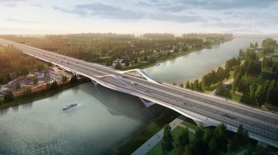 安運橋主橋設(shè)計采用梁-拱型組合體系,立意“荷香”,將荷葉形態(tài)融入到橋梁造型當(dāng)中,荷葉浮于運河之上,整個造型宛如運河上盛開的荷花,生態(tài)自然,與環(huán)境融為一體,給人以生機盎然、自然和諧的美感。