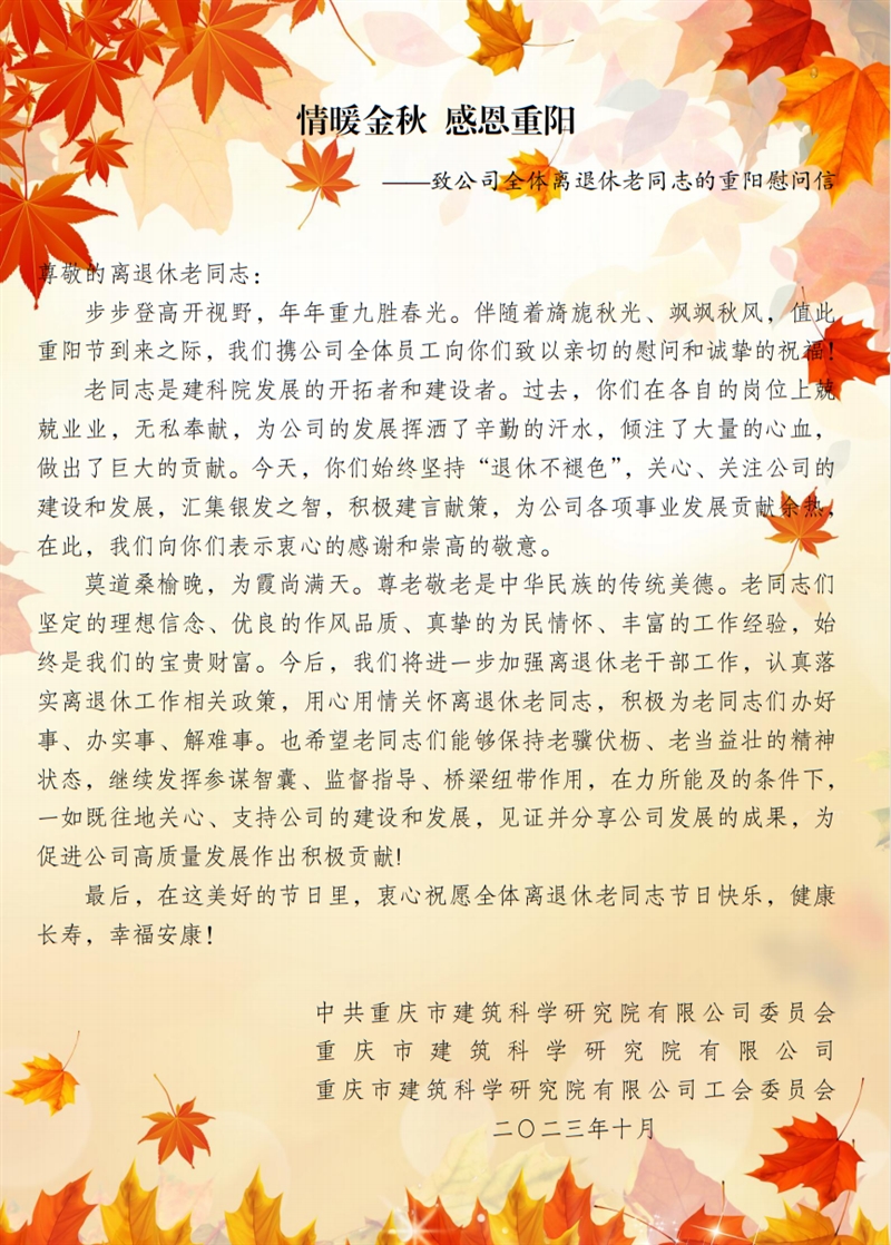 情暖金秋 感恩重陽——致公司全體離退休老同志的重陽慰問信