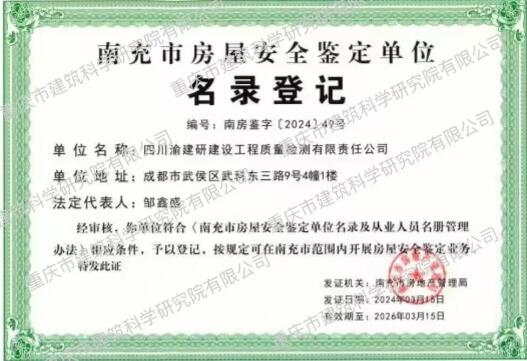 該項名錄登記單位資格的取得,標(biāo)志著四川渝建研公司在房屋安全鑒定領(lǐng)域的專業(yè)資質(zhì)和實力得到了南充市相關(guān)部門的認(rèn)可,公司將有更多機會參與到南充市各類房屋安全鑒定項目中,為更多客戶提供專業(yè)、高效的服務(wù)。