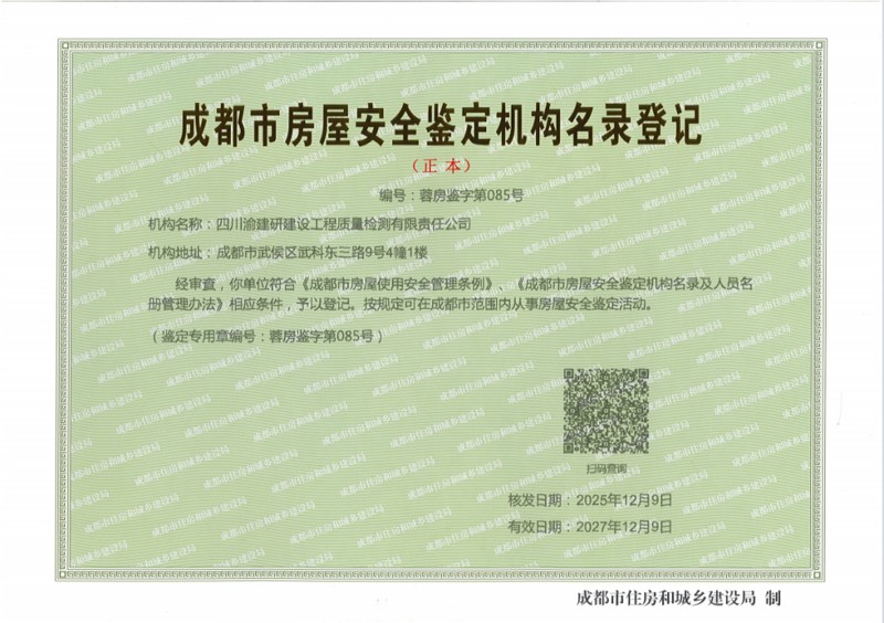 資質(zhì)+1!四川渝建研公司順利通過成都市房屋安全鑒定機(jī)構(gòu)資格審查