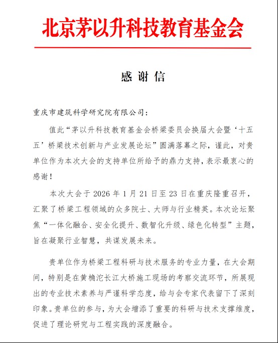 基金會在感謝信中表示,市建科院的監理工作和專業展示,為本次論壇的成功舉辦提供了重要支撐,體現了新時代監理單位在重大工程建設中的技術擔當與行業價值。這份認可,既是對市建科院團隊專業能力的認可,也是對重慶設計集團在橋梁工程領域持續貢獻的肯定。